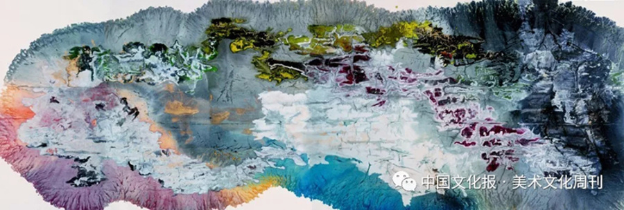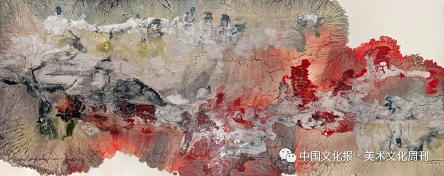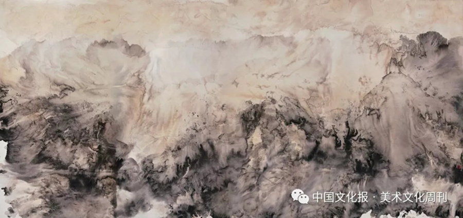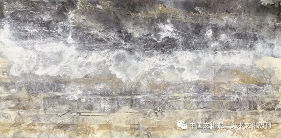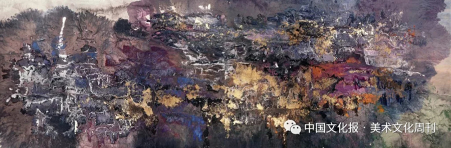与这幅极富革命性的高360厘米、宽280厘米的竖构图《共同的家园》相向呼应的,是令人心神驰荡的宽阔的《互动的世界》。在宽610厘米、高244厘米的画幅中,超越于现实世界具体物象和场景的艺术表现,动荡与静默、绚丽与平淡、混沌与清澈、粗狂与优雅、光明与幽暗,相互交融和互补,既表现出一种关注自然生态、呼唤环境保护的理念和境界,又表现出对国家间包容、理解、和平、公正与协作的精神倡导。