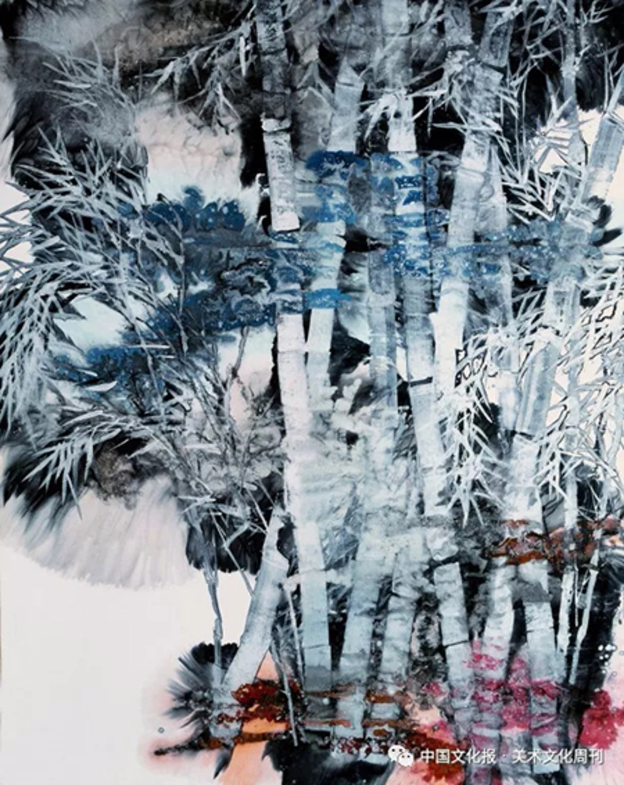 面对这两幅巨作,一个从水墨画走向世界的中国艺术家脱茧重生的历程跃然而出——王林旭以画竹闻名遐迩,二十年前,他就是以葱郁挺拔的竹子与联合国结缘。现在,竹子依然作为《共同的家园》的画面形象,所不同的是,这一次,竹子的表现方式却发生了很大的变化,墨线和笔力让位于水墨的冲渍和色彩的铺盖;原本以线塑形、以墨成面的墨竹,如今以冲墨作底,以岩彩为竹;形与色,墨与影,在宣纸上反复交融和穿插,形成丰富的光感和空间层次。该作品突破了单色绘竹的传统,融合了西方抽象绘画的色彩观念和空间关系,使整个画面蕴含着于形似中求神似、树欲静而风不止的劲健之气,令人耳目全新。