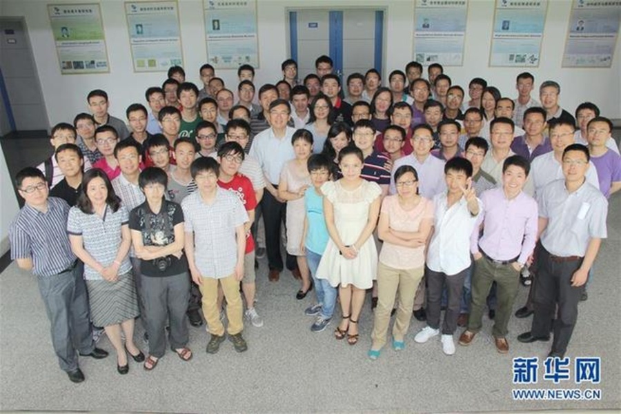卢柯与其团队的合影(照片中间身着浅色衬衫者为卢柯,2014年6月4日摄)。