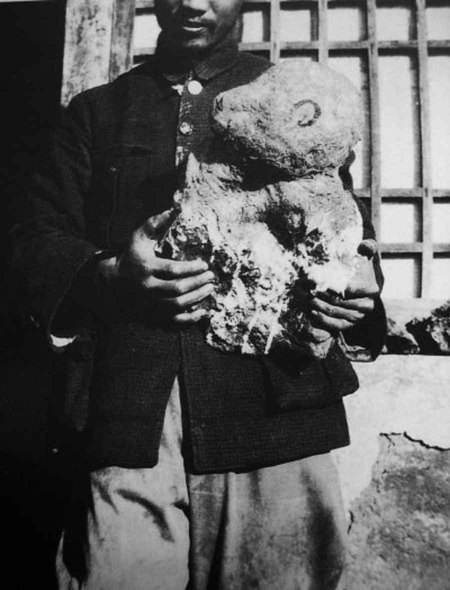 ▲ 抱着发现第一个“北京人”头骨照相的裴文中,因为太兴奋,摄影师只把镜头对准了头骨。