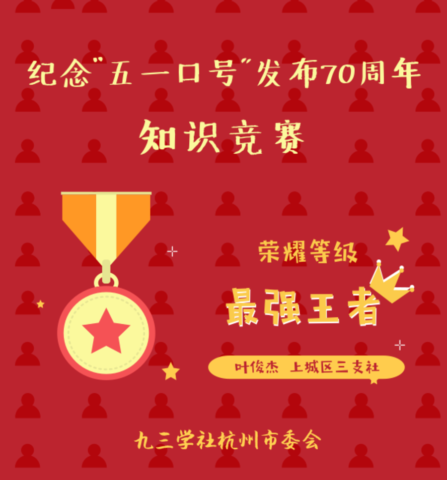4月25日至5月2日,九三学社杭州市委利用“杭州九三”微信公众号,专门开发H5(HTML5.0)页面,开展纪念“五一口号”发布70周年网络知识竞赛。