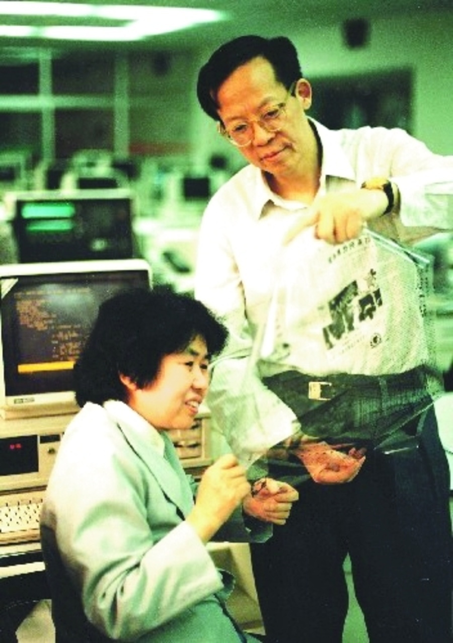 王选生前工作中,左为其夫人陈堃銶