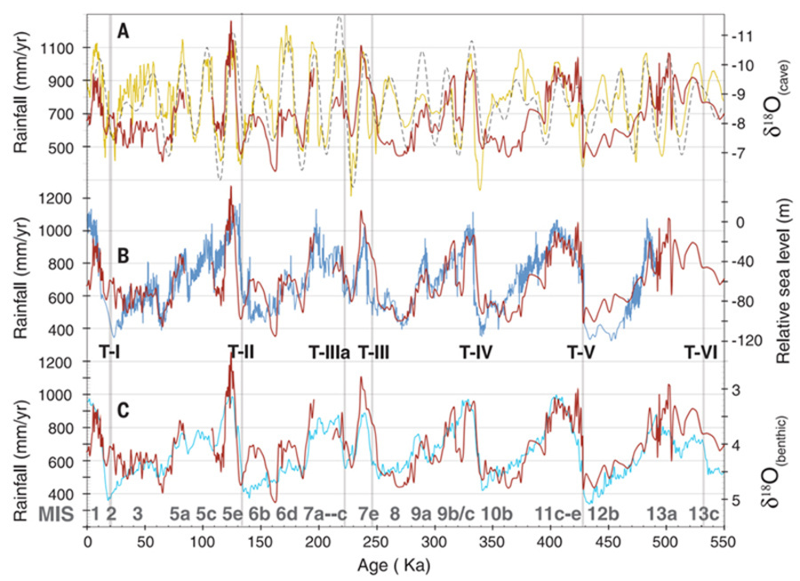 据周卫健介绍,中美合作团队对采集自中国黄土高原南部的中更新世以来黄土样品,利用超高灵敏度加速器质谱,开展宇宙成因核素10Be测试分析与示踪研究,首次定量重建了黄土高原所代表的亚洲季风区,最近55万年以来的降水变化历史,突破了以往在多数研究中主要应用一些气候代用指标定性描述干湿气候变化历史的局限。通过综合对比三宝洞石笋氧同位素、底栖有孔虫δ18O所代表的全球冰量、红海古海平面、北纬65°N夏季太阳辐射以及南北半球夏季30°N-30°S太阳辐射梯度记录,研究人员论证了南北半球低纬夏季太阳辐射梯度是驱动亚洲季风气候的首要因素。
