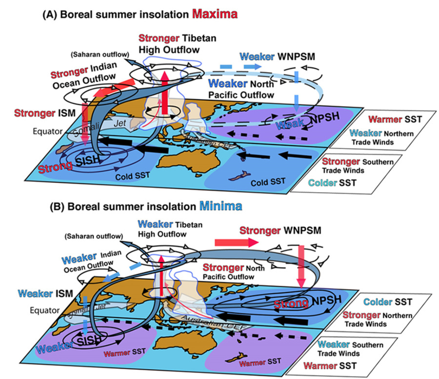 周卫健等在2007年和2014年利用黄土10Be开展末次间冰期以来亚洲季风降水重建的论文中,曾提出南北半球低纬夏季太阳辐射梯度对亚洲季风产生重大影响的思想(Zhou et al., 2007, Radiocarbon;Zhou et al.,2014,JGR)。本文则详细揭示了低纬南北半球间的夏季太阳辐射梯度影响亚洲夏季风强度变化的动力学联系:低纬南北半球间的夏季太阳辐射梯度影响季风气团在对流层上部辐散外流的模式,当有更多的气团辐散外流到南印度洋高压(马斯克林高压),印度夏季风增强,而西北太平洋夏季风减弱;反之,当有更多的气团辐散外流西北太平洋副热带高压时,西北太平洋夏季风加强,而印度夏季风减弱。这两个季风子系统相对强度的变化,改变着从这两个高压区域,输送到东亚季风区水汽的比例。低纬南北半球间的夏季太阳辐射梯度可通过影响印度洋输送到南大西洋的洋流系统,从而影响北大西洋经向翻转环流(AMOC),进而控制着北半球高纬地区的冰量,表明季风环流也是驱动冰期/间冰期全球气候变化的重要因素。