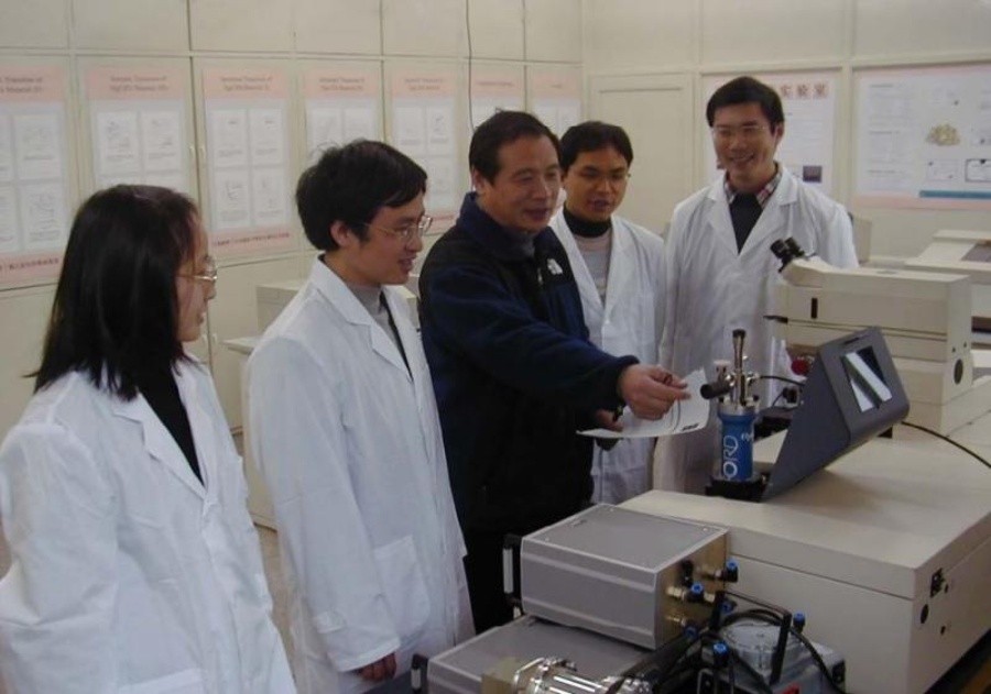 褚君浩和学生们黄志明(杰青)(左二)、胡志高教授(右二)等在实验室