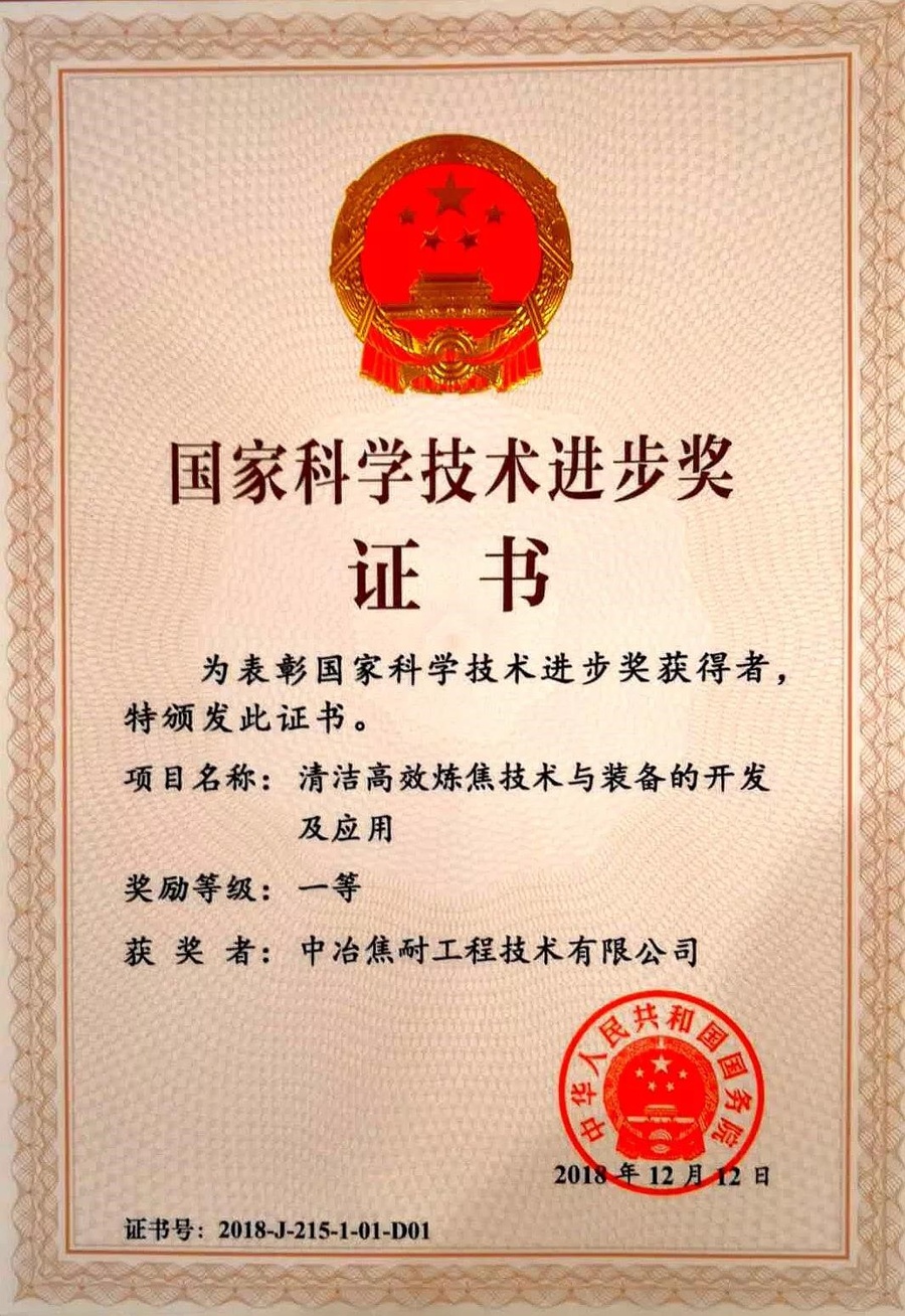 2019年1月8日上午,中共中央、国务院在北京人民大会堂隆重举行国家科学技术奖励大会。中冶焦耐(大连)工程技术公司牵头完成的“清洁高效炼焦技术与装备的开发及应用”,获得国家科技进步一等奖。