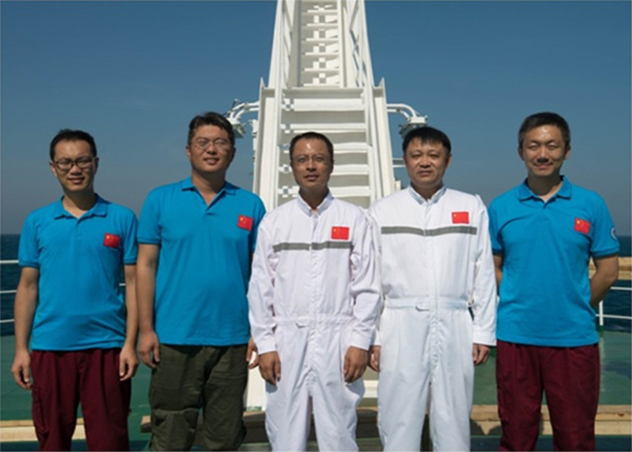 左起:九三学社社员、副研究员张健,九三学社社员、高级工程师连超,九三学社海洋所副主委、高级工程师栾振东,九三学社社员、船长刘合义,九三学社社员、副研究员王昊