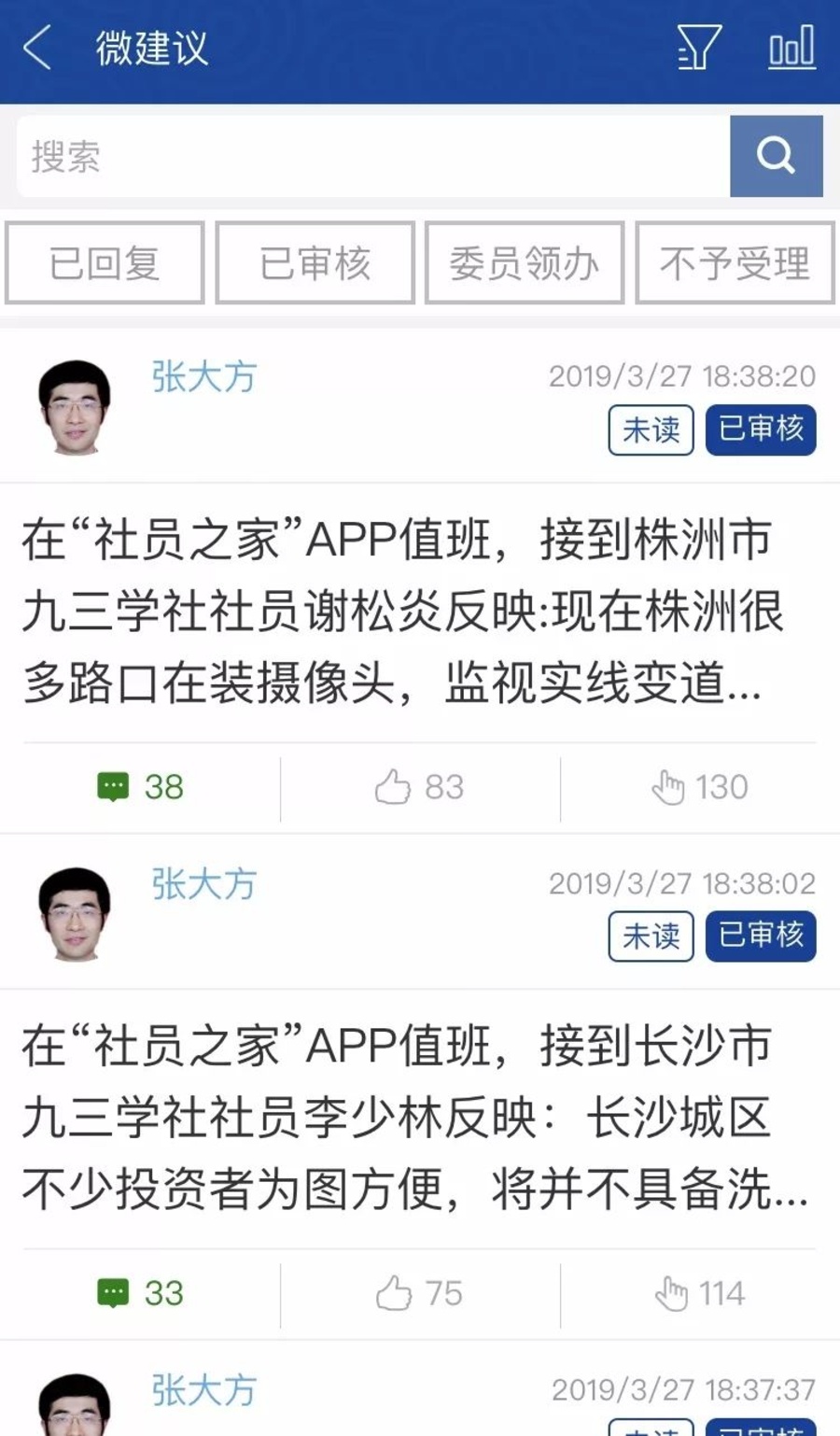 3月27日,省政协副主席、九三学社省委主委张大方在政协云连续提交5条微建议,引起许多委员关注。这5条微建议分别由长沙、株洲、郴州等地的九三学社社员提出,通过张大方提交至政协云。