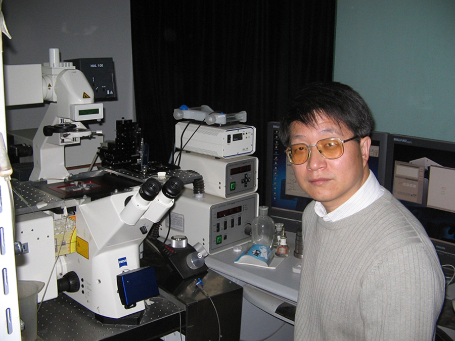 与双光子显微镜结缘,程和平院士有着一段特殊的“显微镜情结”。1990年,程和平留学美国马里兰大学(Baltimore)医学院生理系,1992年,程和平发现在每一次强有力的心脏搏动中传统的细胞钙瞬变(calcium transient)中的一个最小单位,在时间及空间随机触发并叠加、细胞水平呈现的梯级式(graded)钙释放是由于不同数目的“全或无”式的这种最小单位累加所造成的。单细胞可触发约一万个这种最小单位,整个心脏中最小单位数约是5× 量级。所以研究小组确认了这种心肌兴奋-收缩耦联的最小单位。1993年,程和平作为第一作者在《Science》上发表论文命名这种最小单位为“钙火花”(Calcium Sparks),被誉为100年来最杰出的10篇心肌论文之一,由此在生物医学界一举成名。