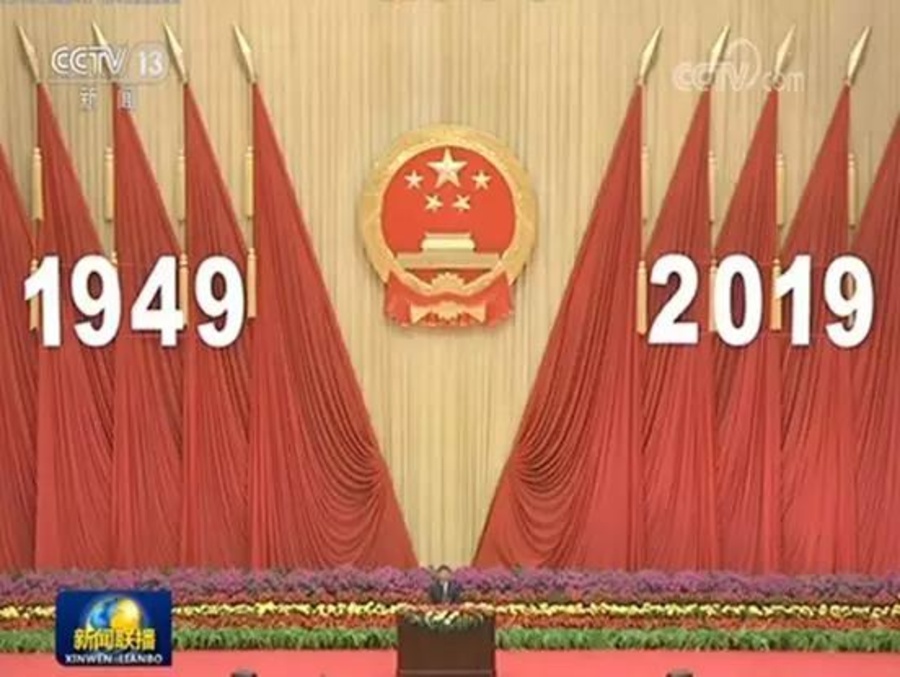 在嘹亮的号角声中,习近平走上主席台,发表重要讲话,代表党中央、国务院,向全国各族人民、全体共产党员,向中国人民解放军指战员和武警部队官兵,向各民主党派和无党派人士,致以崇高的敬意;向香港特别行政区同胞、澳门特别行政区同胞、台湾同胞和广大海外侨胞,致以诚挚的问候;向支持和帮助新中国建设事业的友好国家和国际友人,致以衷心的感谢。