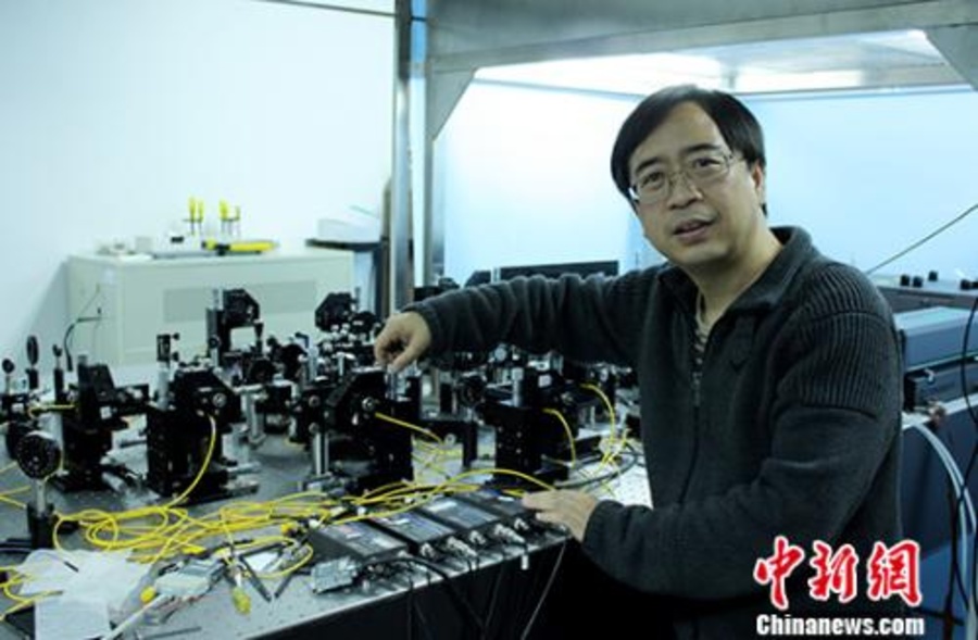 近日,中国科学院院士、量子科学实验卫星“墨子号”项目和中国量子保密通信骨干网络“京沪干线”项目首席科学家潘建伟在北京接受中新社记者专访。图为潘建伟(右一)在研究工作中。(资料图片)中新社发 钟欣 摄