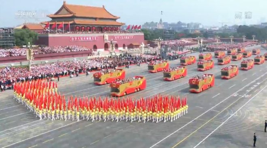 10月1日,庆祝中华人民共和国成立70周年大会在北京天安门广场隆重举行。上午11时32分,伴随着广场电子屏幕上出现的“伟大的中国人民万岁”“伟大的中国共产党万岁”“伟大的中华人民共和国万岁”标语和万千群众唱响的《今天是你的生日,中国》歌曲,“同心共筑中国梦”主题群众游行开始了。
