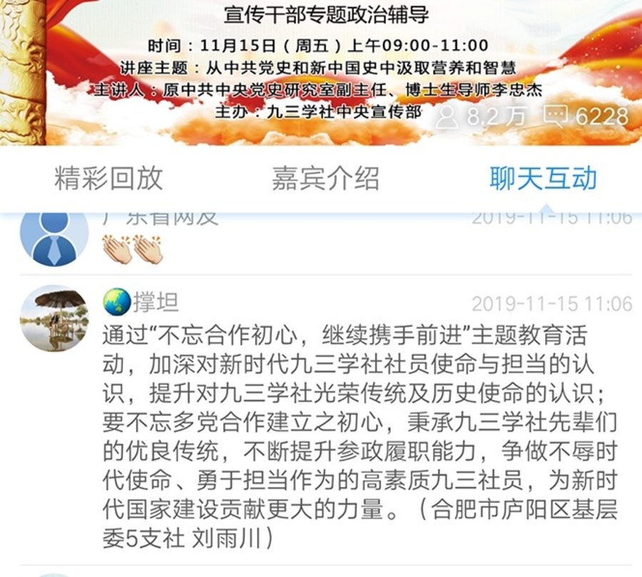 全国各地的社员通过“网络课堂”留言学习心得体会。北京市九三学社社员董译聪说:“70年在人类历史长河中只是弹指一挥间,但对中国人民和中华民族来讲,这是沧桑巨变、换了人间的70年。中华民族迎来了从站起来、富起来到强起来的伟大飞跃,迎来了实现伟大复兴的光明前景。对此,每个九三学社社员都感到无比自豪!”合肥市庐阳区基层社员刘雨川说:“我们要不忘多党合作建立之初心,秉承九三学社先辈们的优良传统,不断提升参政履职能力,争做不辱时代使命、勇于担当作为的高素质九三社员,为新时代国家建设贡献更大力量!”江苏省南京市九三学社社员杨恺说:“不忘老一辈革命家建国维艰,珍惜当今和平稳定环境。撸起袖子加油干!”