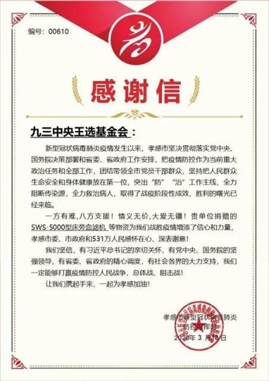 感谢重庆山外山血液净化技术股份有限公司的领导和员工,在孝感疫区封城封路的情况下,克服重重困难,把危重症患者急需的医疗设备送到一线,并派技术人员到一线医院安装、调试、培训医务人员,解决了当地燃眉之急!