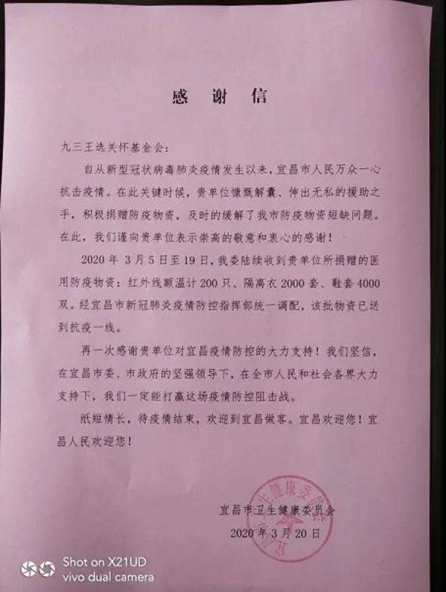 感谢所有捐赠人对基金会的信任和支持!涓涓细流汇成江河,基金会就是一个“爱心”搬运工,正是你们的爱心捐款,转化成了12台CRRT+血浆治疗床旁血滤机、5000台户外红外线温度探测仪、32000副护目镜、25000套防疫隔离衣、40000双鞋套、50000只医用口罩、1500瓶消毒泡腾片、40台医用紫外线灯、150箱免洗洗手消毒剂、640瓶高级医用口喷消毒液、1600套进口防护服等抗疫前线急需的医疗物资驰援湖北并关爱资助了120余名湖北受感染医护人员。因为你们,湖北人民多了一分希望;因为你们,九三之光温暖照亮了荆楚大地!