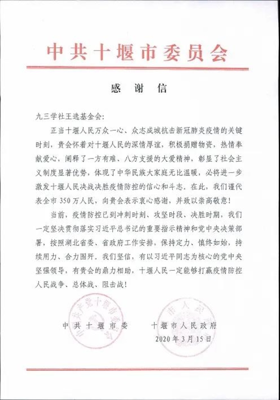 感谢九三学社各级组织、社员及社会各界爱心人士,您们心怀大爱,慷慨解囊,共克时艰,体现了九三人的情怀和担当!