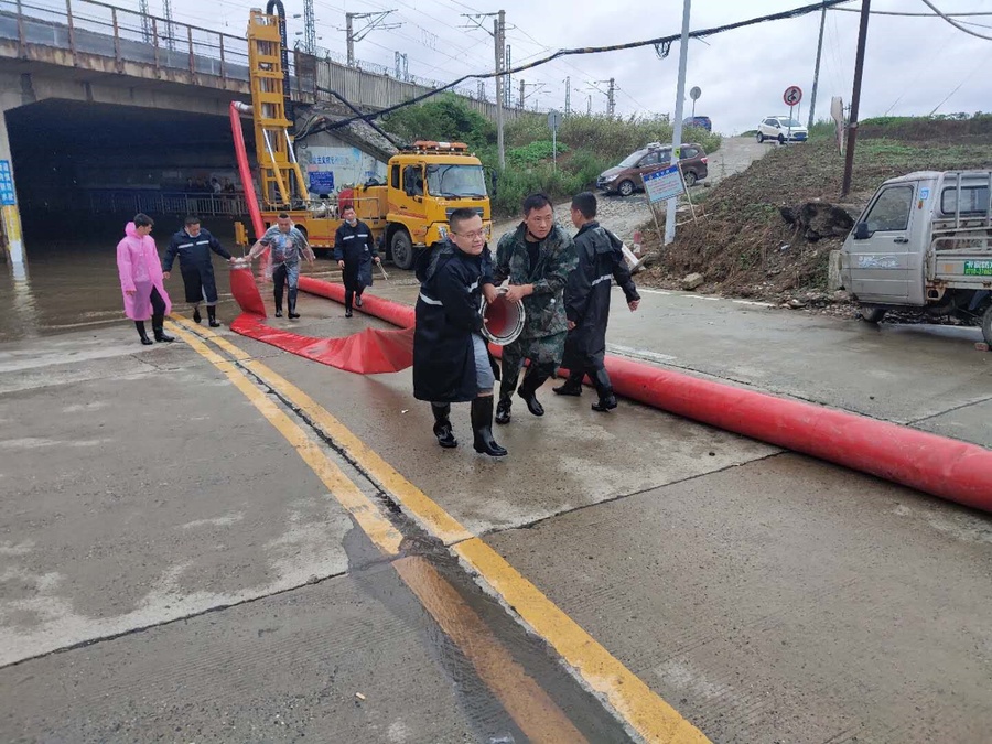 襄阳市发生强降雨过程。城市部分道路积水严重,有的立交、铁路涵洞被淹,交通受到严重影响。襄阳市各部门全城总动员,全力排除积水,九三社员活跃在排水抢险第一线。