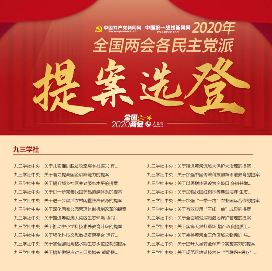 九三学社中央历来高度重视政协提案工作,探索形成了比较完善的提案征集、遴选、统稿机制。特别是近年来在全国政协全面提高提案质量的要求下,九三学社中央积极采取措施,下大气力打造高品质提案。今年的提案准备工作从去年7月就开始启动,面向全国30个省级组织和社中央8个专委会、7个工委广泛征集,同时对调研成果进行转化,汇集提案初稿200多份。后按程序进行遴选、修改和研究,最终向全国政协十三届三次会议提出九三学社中央名义提案51件、九三学社界别提案29件,内容涉及政治法律、科教文化、产业经济、资源环境、社会民生、疫情防控等多方面,如《关于扎实推进脱贫攻坚与乡村振兴有机衔接的提案》《关于推进黄河流域大保护大治理的提案》《关于着力提高国企创新能力的提案》《关于提升城乡社区养老服务水平的提案》等。值得一提的是,在51件社中央名义提案中,有9件针对疫情防控的“专门提案”,是在今年初完成常规提案备稿后的新增内容,已于大会开幕前、疫情防控前期报送全国政协,充分反映了九三学社助力疫情防控的责任担当。此外,社中央共向九三学社界别委员推荐拟作为界别提案备稿30件,经委员们“票决”,有1件“落选”,可见对提案质量把关之严。