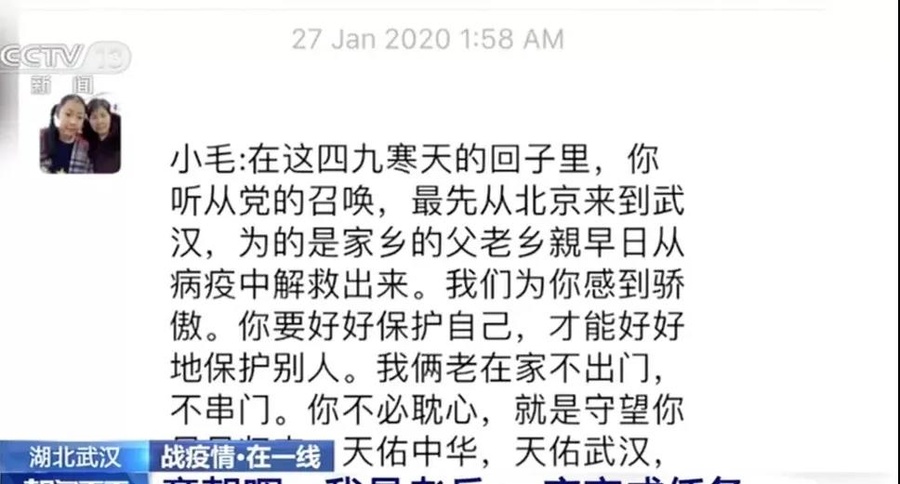 母亲发来微信说:“我们为你感到骄傲。你要好好保护自己,才能好好保护别人。我俩老在家不出门、不串门,你不必担心,就是守望你早日归来!天佑中华,天佑武汉!”