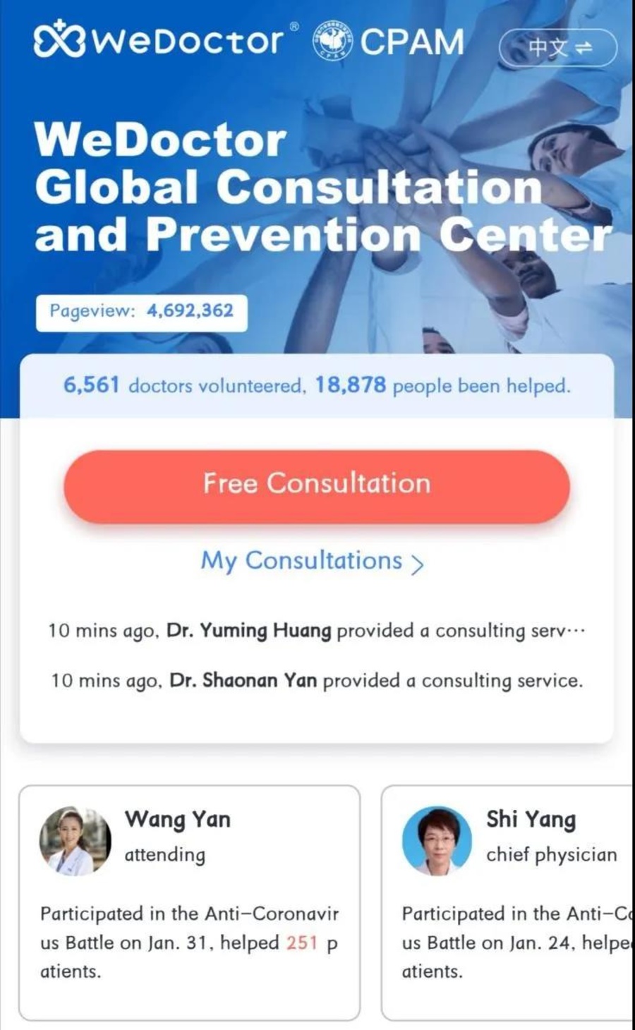 微医此次上线的全球抗疫平台,首期动员了来自全国的6129名专家参与国际救援,这些专家都是国内三甲医院呼吸内科、感染科、全科等科室的主治及以上医师,也是此次中国抗击疫情“空中救援队”里经验丰富的“老兵”。微医还同期上线了于1月29日出版的全球首部关于新冠肺炎防治的中英文对照出版物——《新型冠状病毒感染的肺炎防治知识手册》中英双语版图书。这份科普手册为在华外国友人以及海外同胞带去权威科学防治知识,指导科学防疫。
