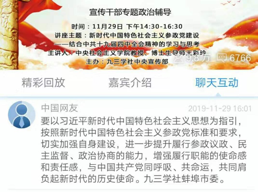 截至目前,通过网络参加5期主题教育活动专题政治辅导学习达到9.8万人次。大家表示,中共十九届四中全会是在我国改革发展关键时期召开的一次极其重要的会议。九三学社社员将把学习贯彻全会精神作为当前和今后一个时期的首要政治任务,不断加强自身建设,增强“四个意识”,坚定“四个自信”,做到“两个维护”,把思想和行动统一到自身建功立业上来,统一到参政履职上来,更好地担负起新时代中国特色社会主义参政党建设使命!
