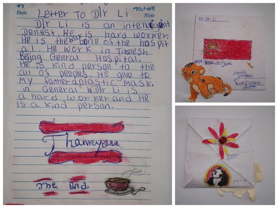 李可兴接过这封信,细心打量了一下,信封正面中央画的是鲜艳的五星红旗,旁边用英语写着:People's Republic of Chinae(中华人民共和国),左下角画的是象征着埃塞俄比亚的非洲雄狮;信封背部上面画的是埃塞人特别喜爱的“国花”––雏菊花,下面画的是中国的国宝––panda(大熊猫);信封里面装着一封用英语歪歪扭扭写的一页信,信的内容大概意思是赞扬了中国医生很勤奋,技术非常好,(不管当地人或者其他人)所有人都一样友好对待,中国医生真是好人!字数虽不多,但能看得出来孩子非常用心,感情真挚,字里行间表达了对中国医生及中国人民的信任、尊重和敬仰。