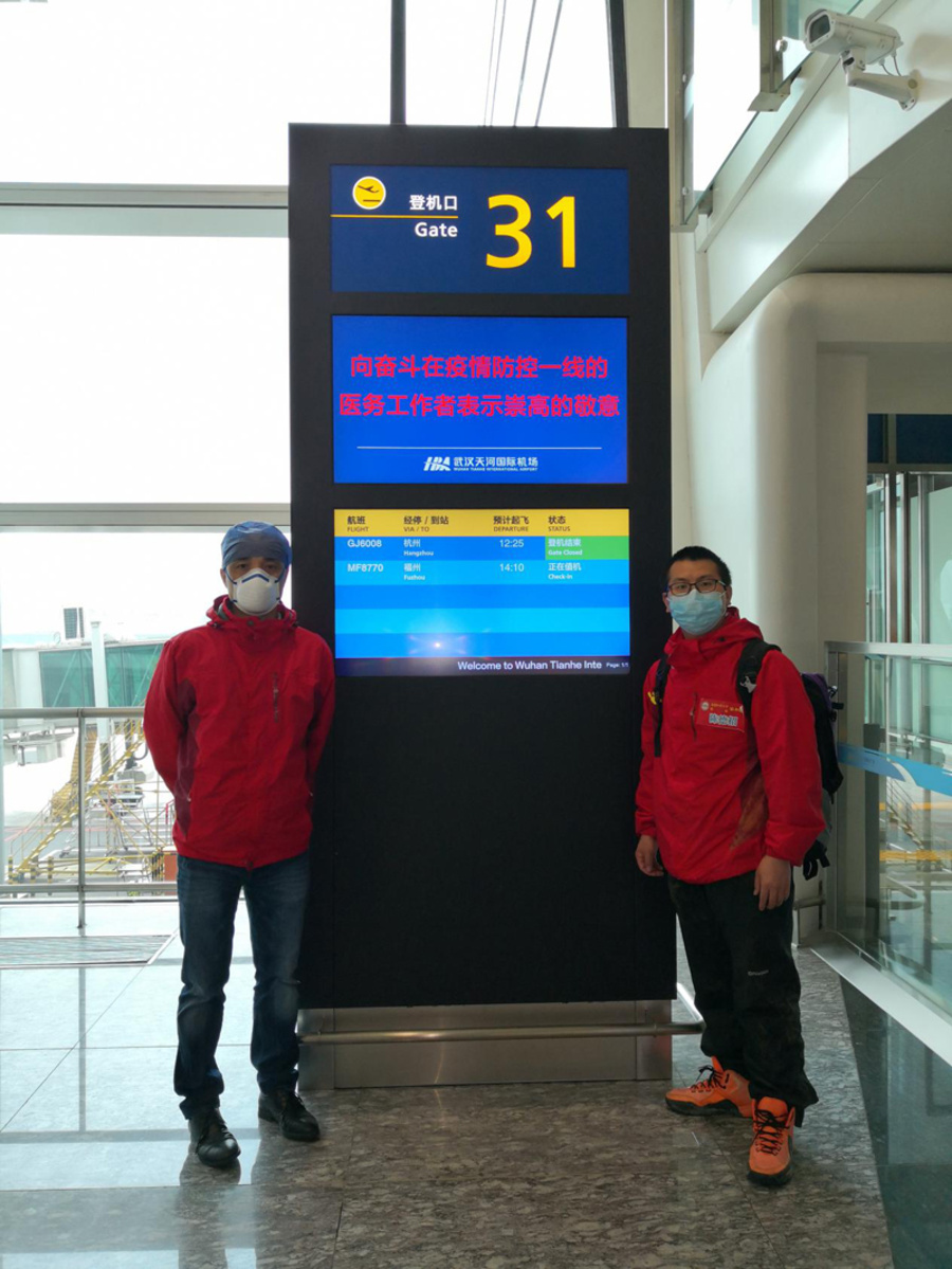 2020年3月31日杜厚伟(左)和陈德招(右)圆满完成援鄂任务后启程回榕