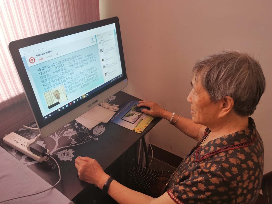 81岁的宁夏九三学社社员,原社石嘴山市委主委朱慧芝参加“网络课堂”学习。她1985年入社,有35年的社龄。
