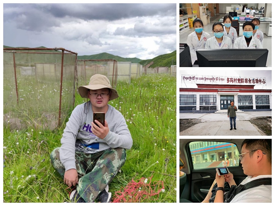 河南省开封市九三学社社员、河南大学副教授刘银占(左一)在海拔4000多米的四川省阿坝州红原县的科研基地收看“网络课堂”。