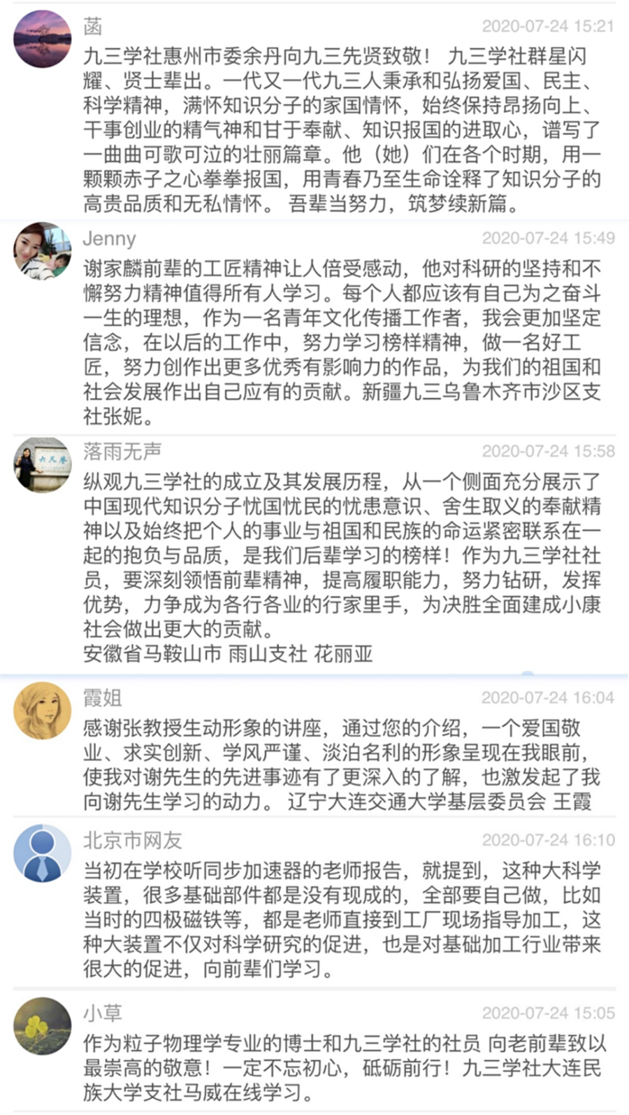 各地社员也通过“网络课堂”的学习留言区积极留言2000余条,纷纷表达对谢家麟院士的缅怀之情。安徽省马鞍山市雨山支社社员花丽亚留言说,“纵观九三学社的成立及其发展历程,从一个侧面充分展示了中国现代知识分子忧国忧民的忧患意识,舍生取义的奉献精神以及始终把个人的事业与祖国和民族的命运紧密联系在一起的抱负与品质,是我们后辈学习的榜样!作为九三学社社员,要深刻领悟前辈精神,提高履职能力,努力钻研,发挥优势,力争成为各行各业的行家里手,为决胜全面建成小康社会做出更大的贡献!”