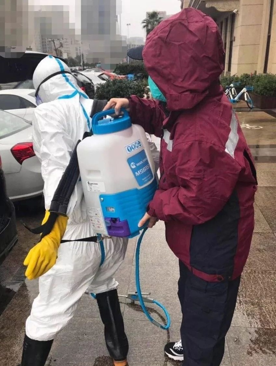 尹志英手提20斤的消毒液,配合队员对重点场所消毒。