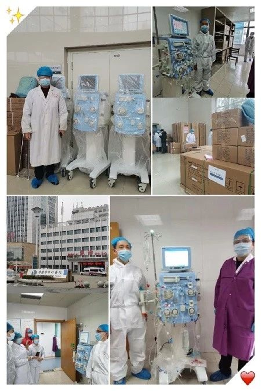 1、12台床旁血滤机(CRRT+血浆治疗)SWS-5000A,125套透析型人工肾一次性使用血液回路导管。这个设备是治疗“新冠肺炎”危重症患者的应急医疗设备,而孝感市全市仅有一台,基金会立即联系资源,迅速采购到了12台床旁血滤机及配套的125套导管耗材,及时联系厂家,送往疫情严重设备急缺的孝感市中心医院、孝感市第一人民医院、孝感市中医医院、汉川市人民医院、应城市人民医院、云梦县人民医院、安陆市普爱医院、大悟县人民医院及孝昌县第一人民医院等9家县市医院。在疫区封城封路的情况下,技术服务人员克服重重困难运输、安装、调试并现场培训医务人员,解决了当地燃眉之急,在救助重症患者过程中及时发挥了重要作用。