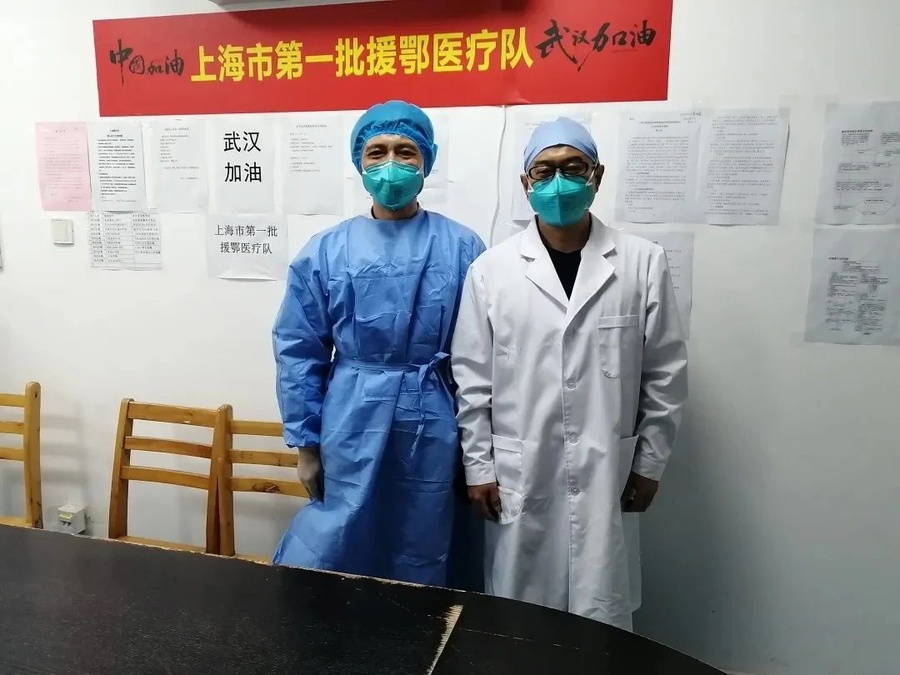 3月21日 武汉,金银潭医院 两位援鄂“九三人”在武汉金银潭医院第一次相逢。右为上海市精神卫生中心生化研究室主任张晨。