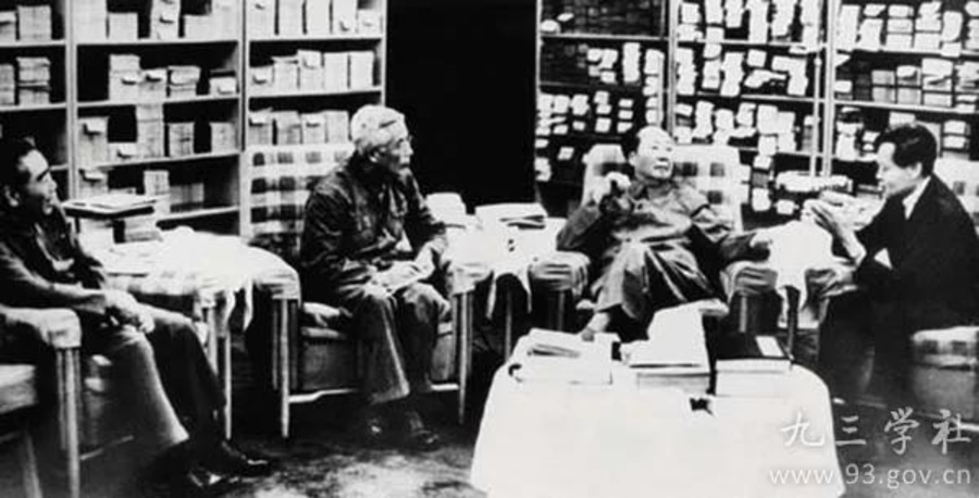 1973年,周培源(左二)陪同毛泽东、周恩来会见杨振宁。