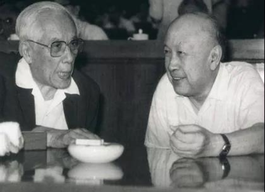 1986年6月27日,在中国科协第三届第一次全委会上,钱学森(右)当选为中国科协主席。周培源(左)被授予名誉主席。