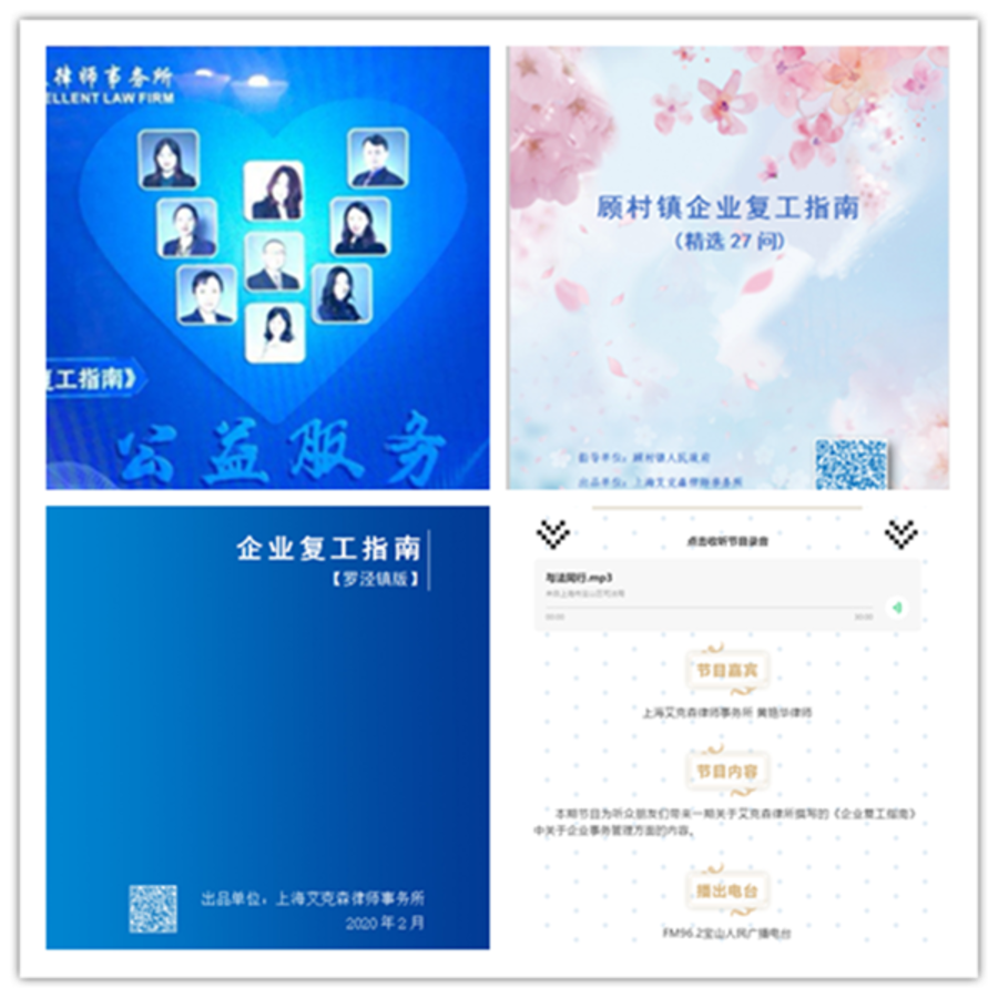面对复工复产,黄燕华带领全所律师就疫情防控期间企业较为关心的劳动人事、合同履约等方面的法律问题,分别汇编了《顾村镇企业复工指南》《罗泾镇企业复工指南》《通用版企业复工指南》等,为企业合规经营有序发展助力。