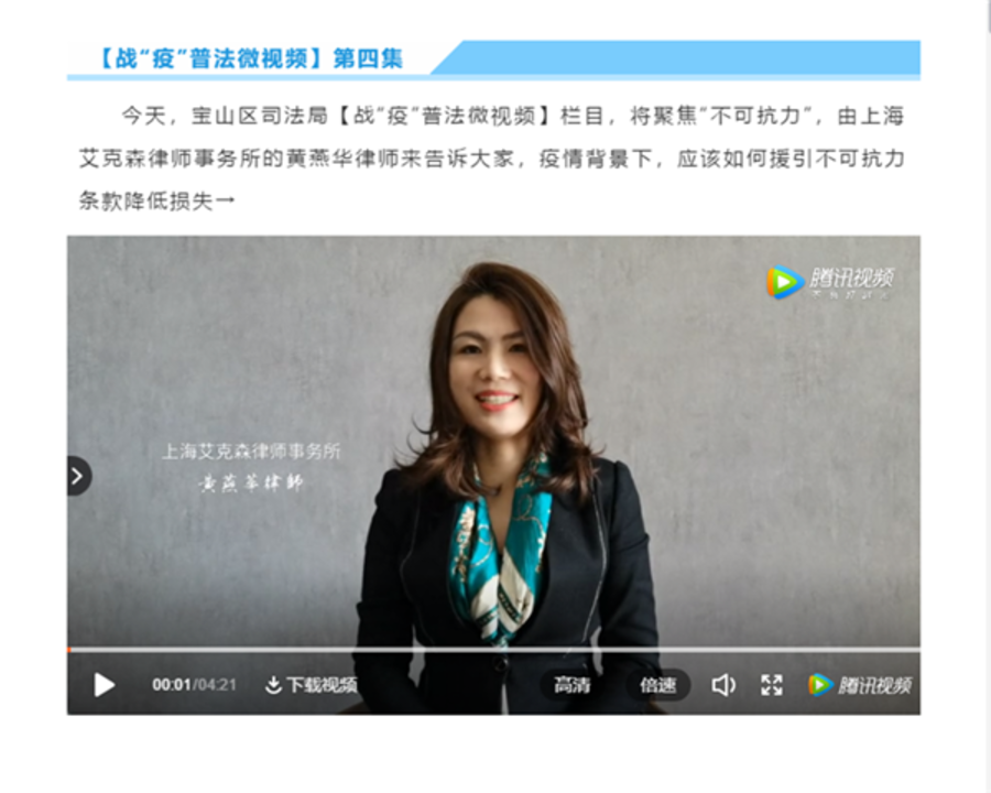 黄燕华还先后参加了宝山区司法局《战“疫”普法微视频》、宝山区人民广播电台《与法同行》节目的录制,解读疫情下,个人和企业可能遇到的法律为题。