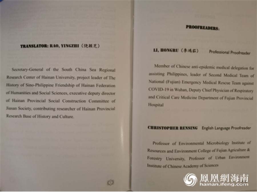 《方舱医院工作手册(第三版)》和《方舱医院患者手册(第三版)》这两份礼物内页中关于饶颖芝的译者简介。图片由中国援菲抗疫医疗专家组提供。