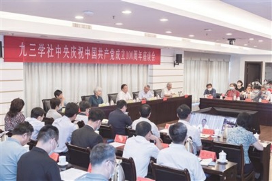 图为7月6日,九三学社中央召开庆祝中国共产党成立100周年座谈会,九三学社中央主席武维华出席并讲话,常务副主席邵鸿主持会议。