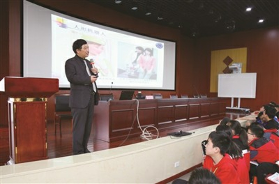 图为4月1日,九三学社中央科普工委副主任、中国科学技术大学教授王永在“九三学社中央院士专家科普行走进龙游”活动中,为龙游华茂外国语学校的学生作科普讲座。