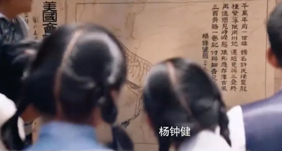 这是电影《无问西东》的截屏,画面里那个站在恐龙面前的人、那个把恐龙带回西南联大的人,就是杨钟健教授。