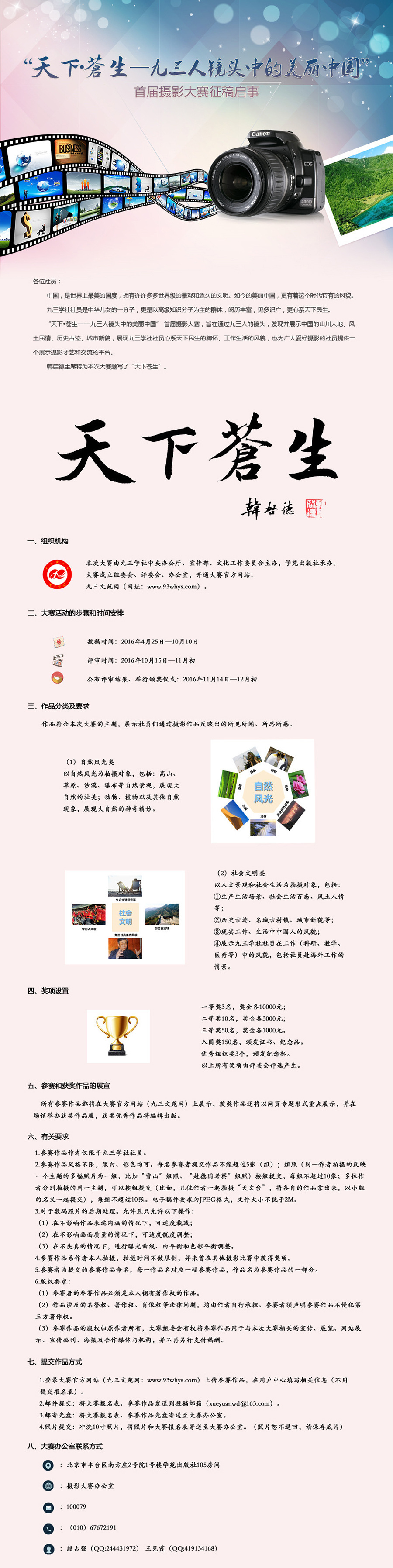 为增强社组织凝聚力,经社中央领导同意,决定在全社举办“天下•苍生——九三人镜头中的美丽中国”首届摄影大赛,大赛由社中央办公厅、宣传部、文化工作委员会主办,学苑出版社承办(具体内容及要求详见附件大赛征稿启事)。请各地做好组织动员工作,使社员积极参与活动,确保大赛圆满成功。