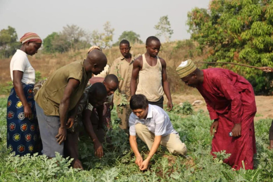 中国—粮农组织南南合作项目派遣的中国专家在尼日利亚实地指导农民进行西瓜种植(资料图)