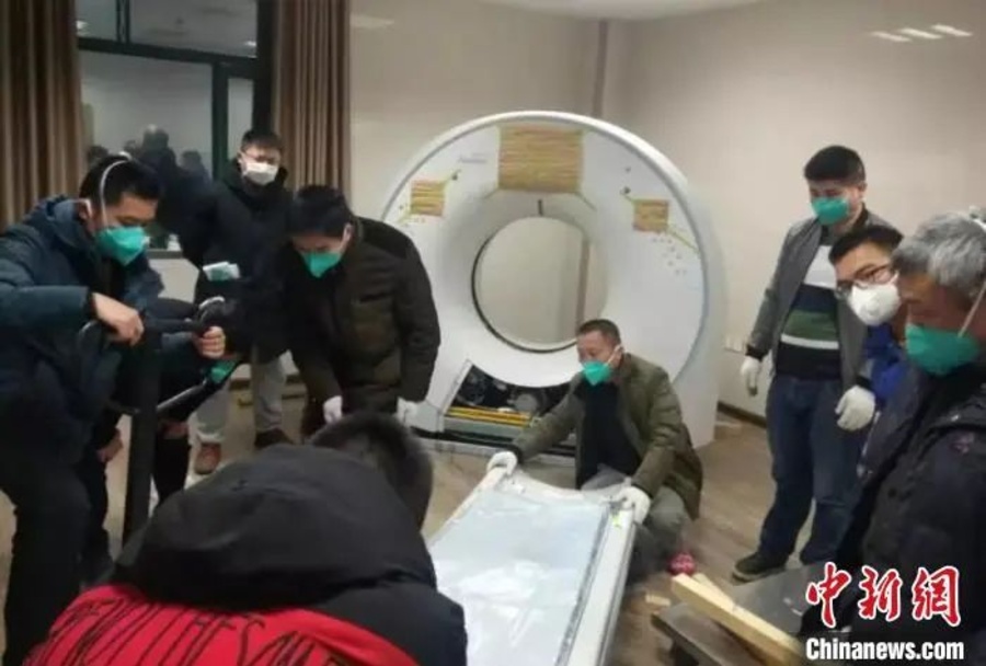 1月29日,由360公益基金会从香港采购的移动式X光机运抵黄冈市中医医院,几位“全副武装”的工程师正在全力安装调试。(360供图)