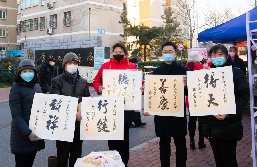 3月3日,他联系了五道轩茶馆,代表九三学社海淀区委和九三学社首都师范大学委员会,向社区值守人员赠送了八箱茶叶和其它慰问品,并为社区书写了“德馨绛帐”,赞美社区值守人员的德,使老师们的家更加安全温馨了。他还书写了10幅作品赠送社区值守人员。社区居委会书记徐惠同志说:“这对大家是非常大的鼓舞!疫情结束后,我们争取评选十大校园卫士,每人赠送一幅您的作品。”