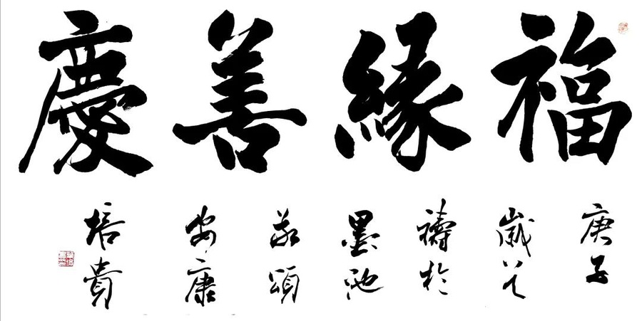 为了达到更好的效果,很多作品饱含匠心。比如,提供给书法频道义卖的《福缘善庆》,特意写了公众喜闻乐见而且饱含中国传统文化精神的内容,而且用他极少面世的楷书书写,希望更有利于公众的接受。这件作品最终拍得善款3.9万元,另有3件作品在北京文联、清美光华等拍得0.89万元,总计4.79万元,全部捐赠。他为首都师范大学社区值守人员所写的十幅作品,“得天”、“善庆”、“德馨”、“行健”、“致祥”“康宁”“弘义”“兴仁”“鸿福”“凝瑞”,也是如此。