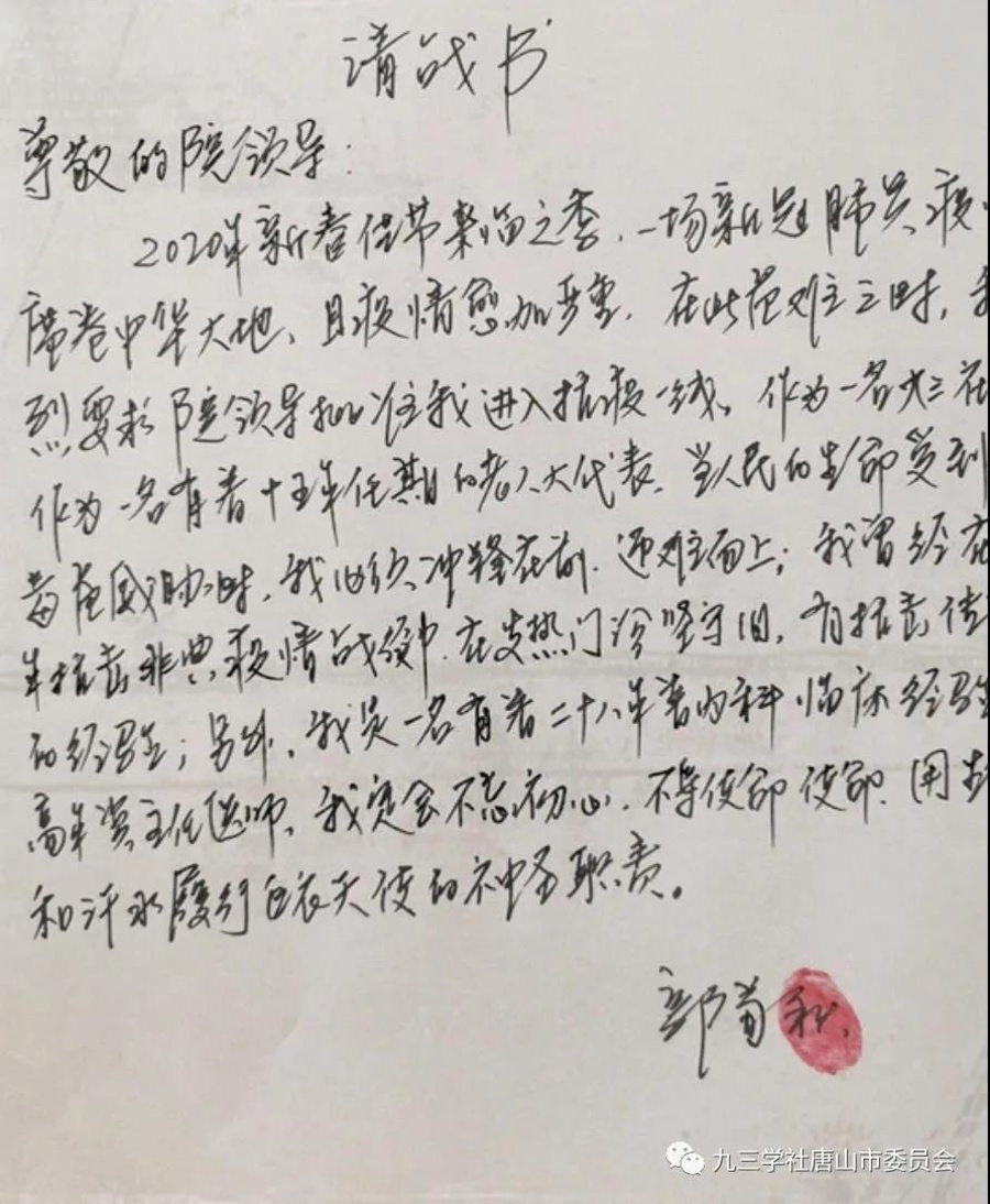 2020年春节,新冠肺炎疫情爆发,时刻牵动着九三学社社员、唐山市古冶区医院副院长郭菊秋的心。全院医务人员取消休假、在岗待命,郭菊秋第一时间向医院党组织递交了请战书,请求到抗疫一线,因为在十七年前,她有着抗击非典的经历,比年轻同志更有经验。