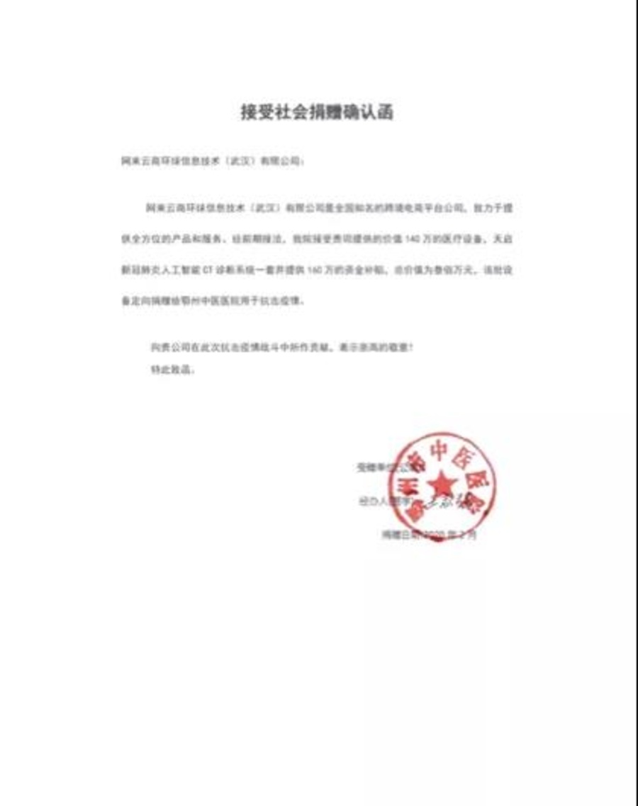 在了解鄂州中医医院缺少医疗设备后,郑玉鸿积极联系设备生产厂商采购,捐赠“联影DR592移动设备”一台(价值 140 万元人民币),天启新冠肺炎人工智能CT快速辅助诊断系统一套,并为鄂州中医医院购买联影80排CT提供160万元资金支持。