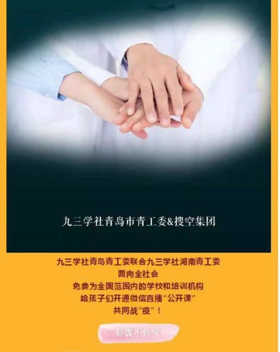 社青岛市委联合社湖南省青工委,共同发起了“停课不停学”项目,免费向全国所有学校、培训机构提供网络视频服务平台,给孩子们开通微信直播“公开课,共同战疫”。很多社员将自身业务和网络课堂相结合,如潍坊社员刘艳霞、沈法鹏,菏泽社员宋宪萍,聊城社员刘亚欣,力求在网络教学中精益求精,出色完成课程的录制,及时化解学生及家长各种恐慌和焦虑情绪。