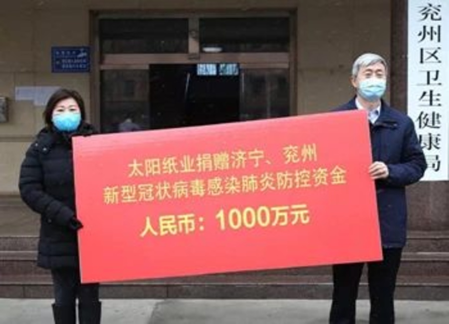 济宁太阳纸业副董事长李娜代表企业向济宁市红十字会捐款1000万元和价值10万元的生活用纸、消毒用品等防疫物资。